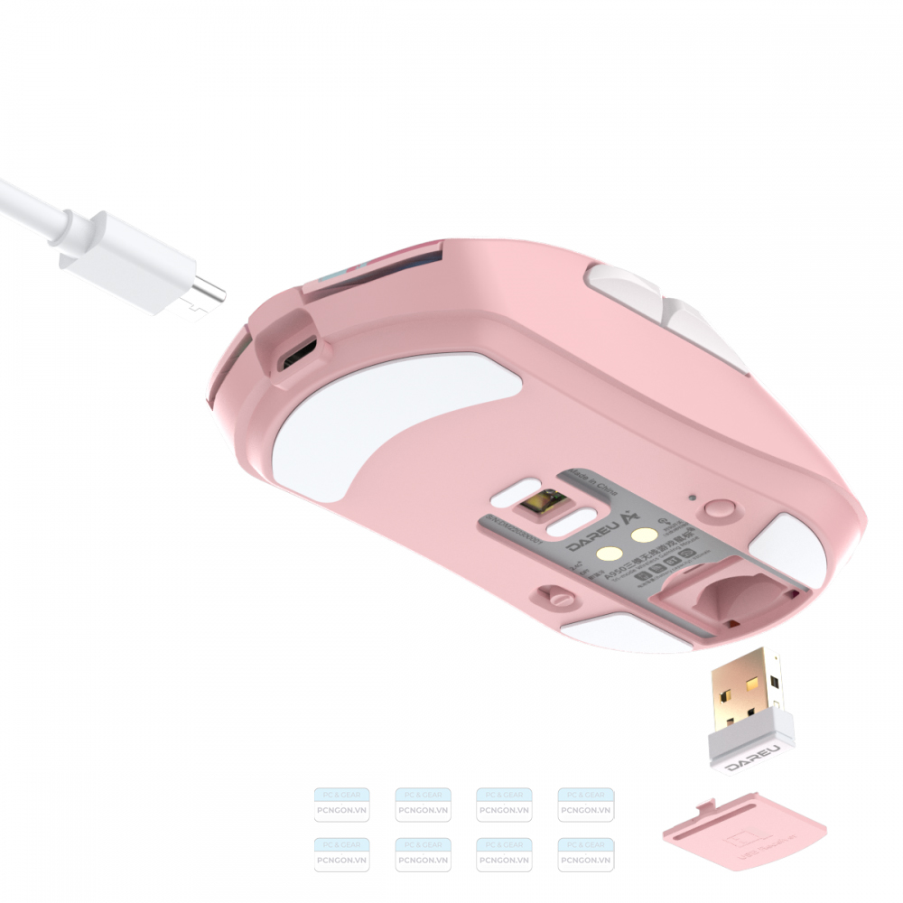 Không chỉ mạnh về hiệu năng, chuột máy tính không dây Gaming DAREU A950 TRIPLE MODE (Black/Pink) còn được trang bị dock sạc nhanh hiện đại, giúp quá trình sạc pin trở nên gọn gàng và tiện lợi hơn bao giờ hết. Người dùng chỉ cần đặt chuột lên dock là có thể sạc nhanh chóng, sẵn sàng sử dụng trong thời gian ngắn. Thời lượng pin bền bỉ cho phép sử dụng liên tục nhiều ngày, hạn chế tối đa việc gián đoạn khi đang chơi game hoặc làm việc. Đây là điểm cộng rất lớn cho những ai yêu thích sự tiện nghi và tối ưu không gian setup.