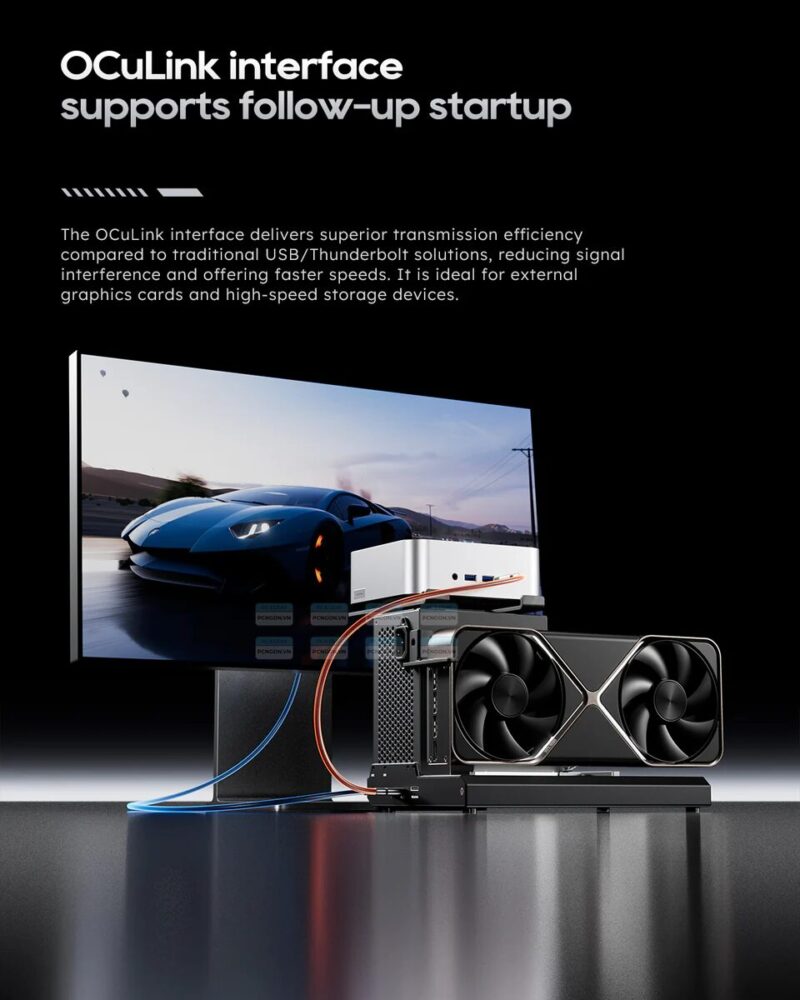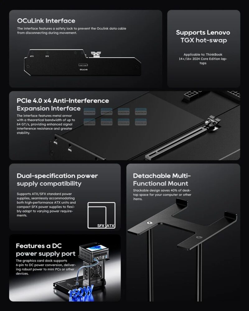 Dock eGPU EG02 được thiết kế để tương thích với nhiều loại card đồ họa chuẩn desktop, cho phép gắn các card có kích thước lớn mà không gặp giới hạn chiều dài. Kiểu dáng mở hoặc khung dễ thao tác giúp người dùng tự thay card, nâng cấp nhanh chóng — phù hợp cả với người muốn dùng card mạnh cho game lẫn creator cần GPU tính toán/đồ họa.