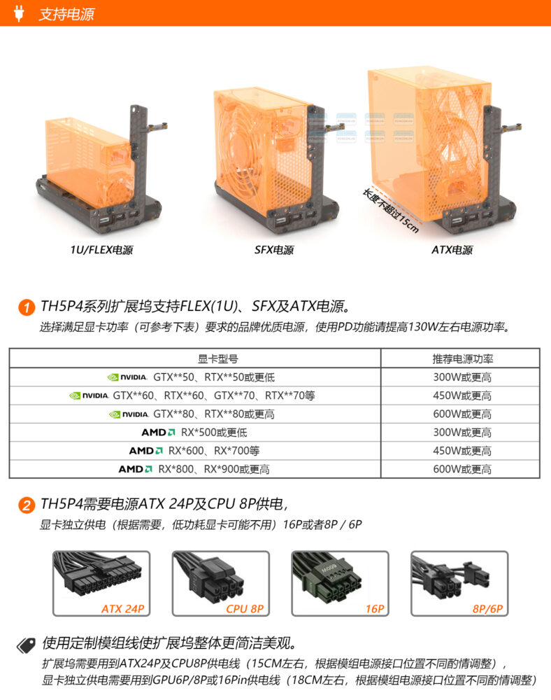 Một trong những ưu điểm nổi bật của Dock eGPU Thunderbolt 5 TH5P4 là khả năng hỗ trợ đa dạng chuẩn nguồn ATX, SFX và FLEX, mang lại sự linh hoạt tối đa khi lắp ráp. Người dùng có thể tùy chọn nguồn theo nhu cầu công suất mà không bị giới hạn. Ngoài ra, thiết bị không giới hạn công suất card đồ họa, cho phép sử dụng cả những GPU cao cấp như RTX 4090, mở ra cơ hội tối ưu hiệu năng cho mọi hệ thống.