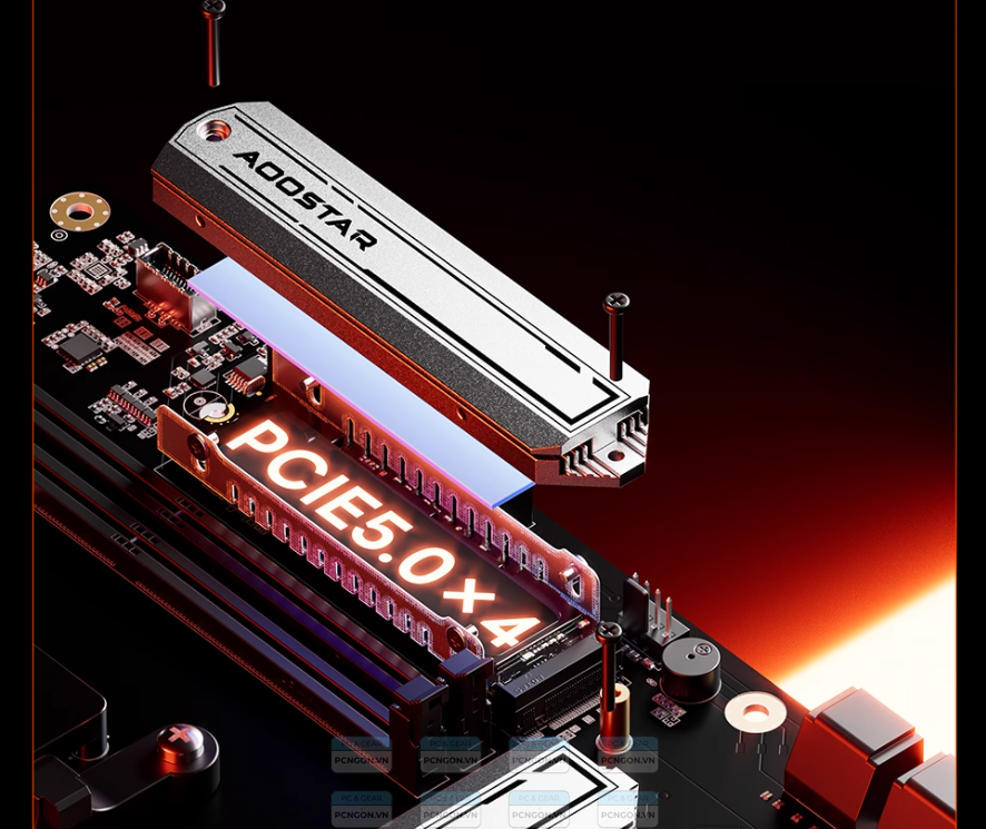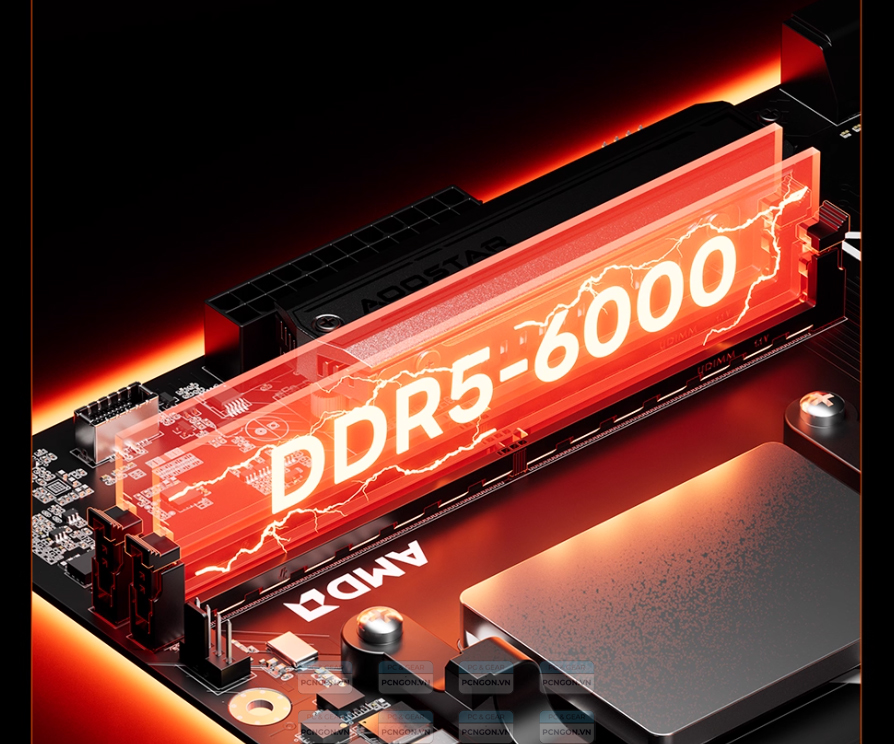 Mainboard Aoostar này hỗ trợ 2 khe RAM DDR5 với dung lượng tối đa 96GB và khả năng ép xung lên đến 6000MHz (OC). Chuẩn DDR5 mới không chỉ tăng băng thông truyền dữ liệu mà còn giảm điện năng tiêu thụ, mang đến hiệu suất ổn định và độ phản hồi nhanh hơn nhiều so với DDR4. Điều này giúp người dùng khai thác tối đa tiềm năng của CPU Ryzen 9 9955HX trong các tác vụ đa nhiệm và xử lý dữ liệu chuyên sâu.