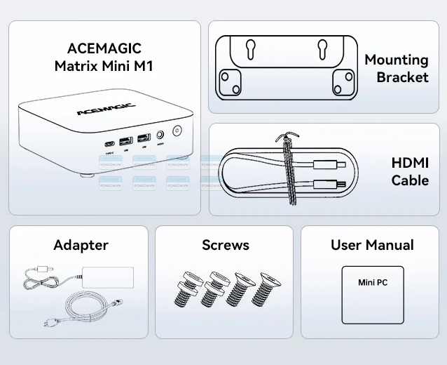 Bộ sản phẩm bao gồm1 x Mini PC, 1 x Adapter nguồn, 1 x Sách hướng dẫn sử dụng, 1 x HDMI, 1 x Vesa Mount, 1 x Bộ ốc