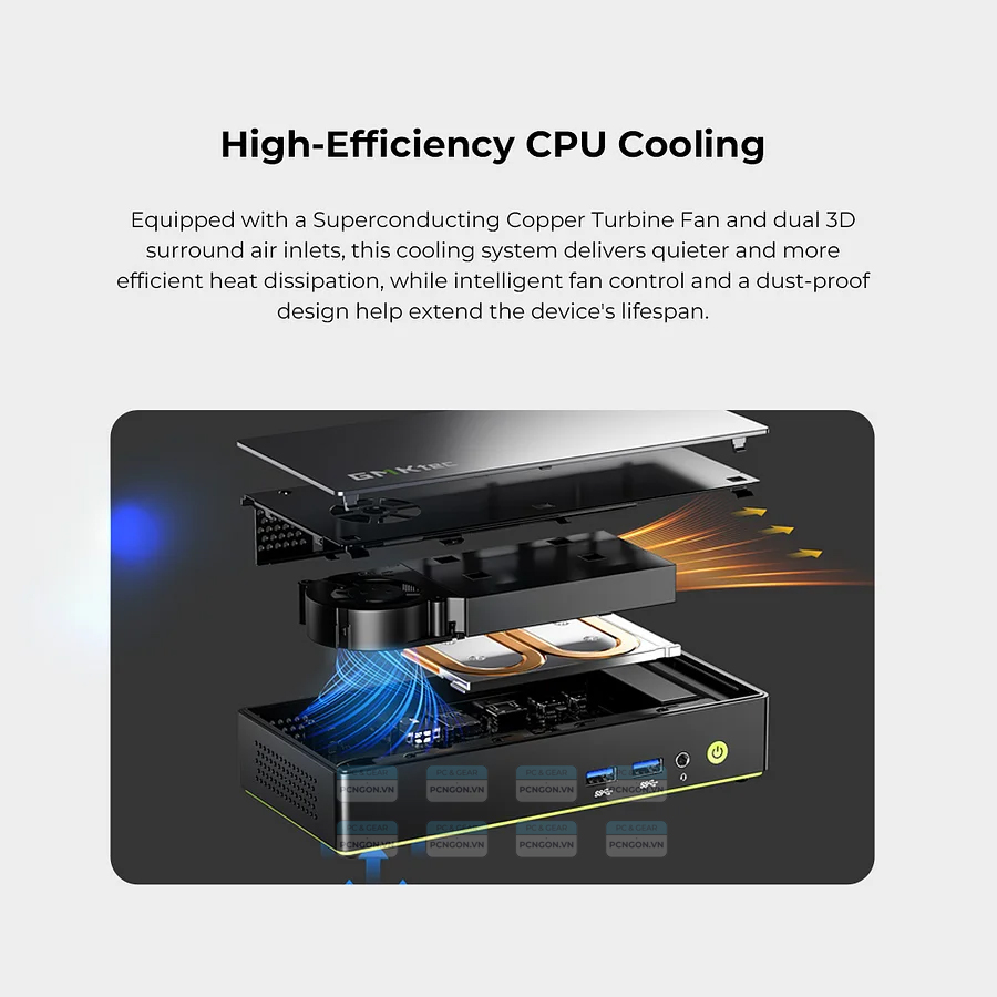Máy tính Mini PC GMKtec K13 Intel Ultra 7 256V này hỗ trợ hai khe SSD M.2 PCIe 4.0 với dung lượng tối đa lên đến 16TB, giúp mở rộng lưu trữ dễ dàng cho nhu cầu lâu dài. Bộ nhớ LPDDR5X tốc độ cao 8533MT/s giúp tăng hiệu suất tổng thể, đặc biệt trong các tác vụ đa nhiệm và AI. Bên cạnh đó, hệ thống tản nhiệt với ống đồng kép và quạt giúp máy hoạt động ổn định, duy trì hiệu năng cao mà vẫn giữ độ ồn ở mức thấp, đảm bảo trải nghiệm sử dụng lâu dài.