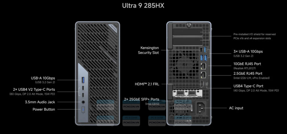 Cổng IOFront: ​2 x USB4 V2 Type-C Ports ​(80 Gbps, DP 2.0 Alt Mode, 15W PD)​, 1 x USB 10Gbps Type-A Port ​(USB 3.2 Gen 2), 1 x 3.5mm Audio Jack; Rear: 2 x 25GbE SFP+ Ports (Intel E810), 1 x 10GbE RJ45 Port (Realtek RTL8127), 1 x 2.5GbE RJ45 Port (Intel I226-LM, vPro Enabled), 1 x HDMI™ 2.1 FRL, ​1 x USB4 Type-C Port ​(40 Gbps, DP 2.0 Alt Mode, 15W PD), 3 x USB-A 10Gbps (USB 3.2 Gen 2)