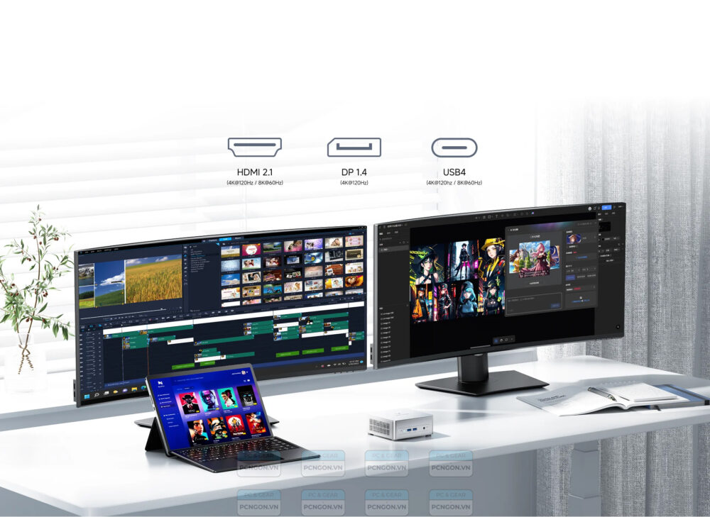 Mini PC Minisforum này đi kèm RAM 16GB DDR5 hiệu năng cao cùng khe SSD M.2 PCIe Gen4, đảm bảo tốc độ truy xuất dữ liệu nhanh, giảm thiểu thời gian khởi động và tăng khả năng phản hồi của hệ thống. Người dùng cũng có thể linh hoạt nâng cấp ổ lưu trữ theo nhu cầu, giúp tối ưu dung lượng cho công việc hoặc giải trí.
