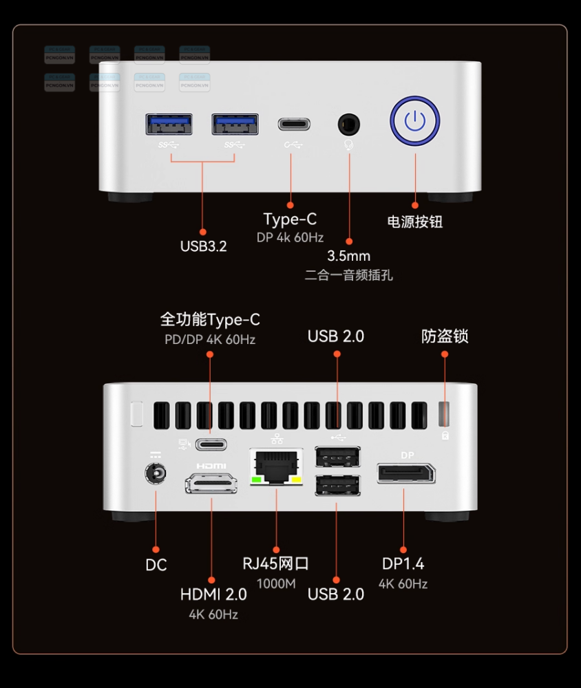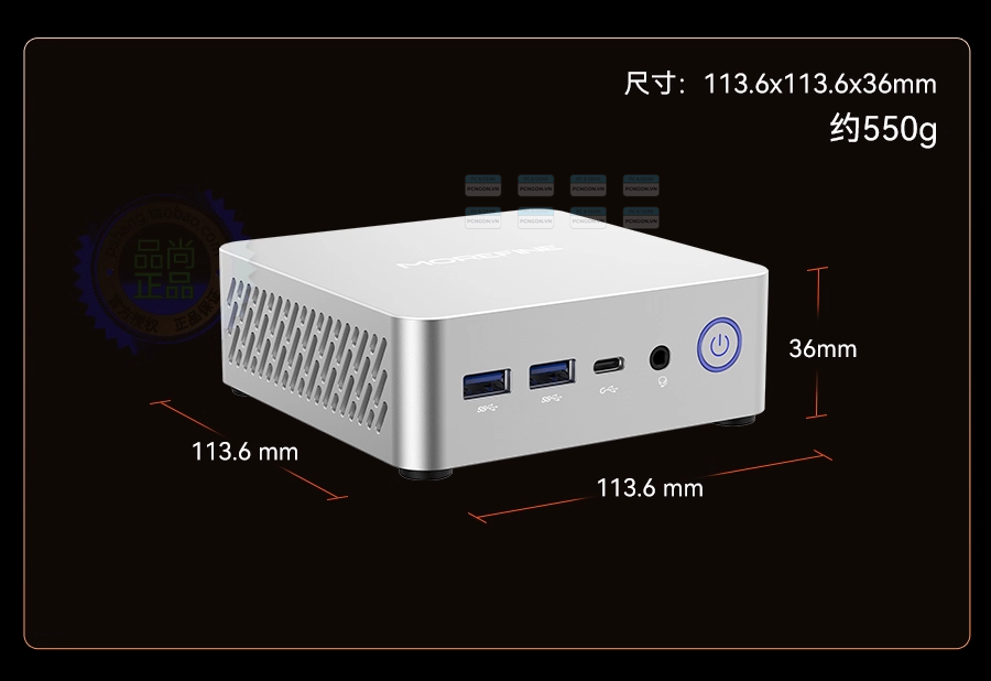 Kích thước chỉ 113.6×113.6×36mm, nặng khoảng 550g, vỏ kim loại cao cấp giúp tản nhiệt hiệu quả. Nguồn 100W (20V/5A) bảo đảm hiệu suất cao mà vẫn tiết kiệm điện, vận hành êm ái.
