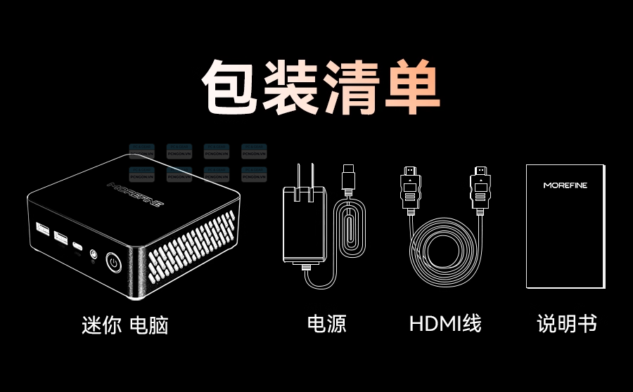 Bộ sản phẩm bao gồm1 x Mini PC, 1 x Charge Adapter, 1 x Manual, 1 x HDMI