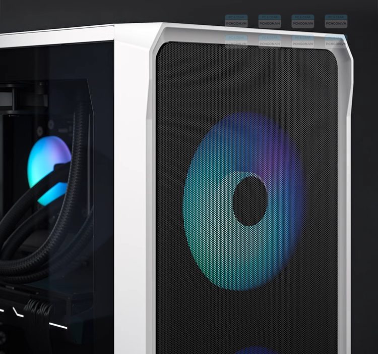 Fractal Focus 2 sở hữu thiết kế mặt trước dạng lưới thép cứng cáp giúp không khí lưu thông dễ dàng vào bên trong thùng máy. Hệ thống gồm hai quạt 140 mm Aspect 14 RGB được lắp sẵn ở mặt trước giúp làm mát các linh kiện hiệu quả ngay từ khi khởi động. Ngoài ra, người dùng có thể lắp thêm đến 6 quạt 120 mm hoặc 4 quạt 140 mm để nâng cao khả năng tản nhiệt toàn diện.
