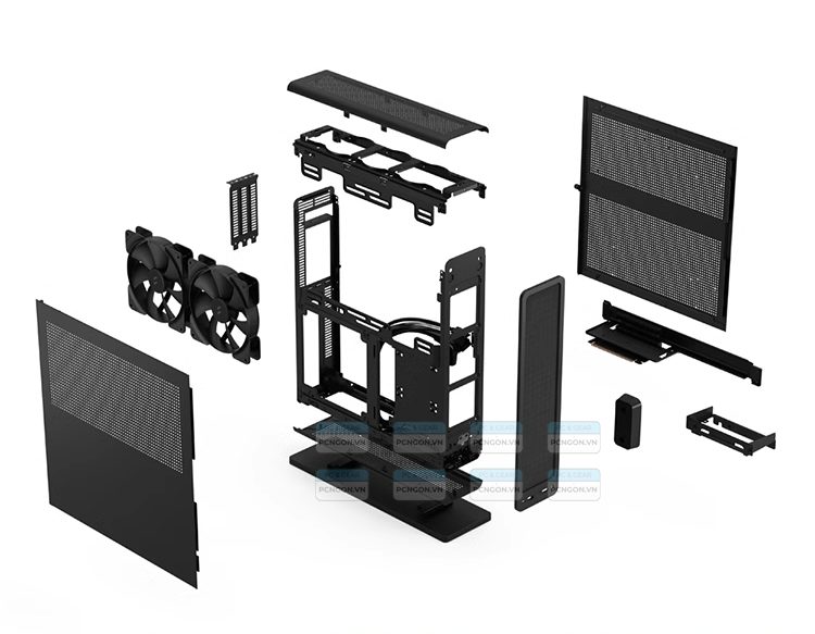 Fractal Ridge sở hữu thiết kế tối giản với vẻ ngoài thanh lịch, dễ dàng hòa hợp với mọi không gian sống hoặc làm việc. Điểm nổi bật là khả năng xoay chuyển giữa tư thế dọc và ngang (vertical & horizontal orientation), cho phép người dùng bố trí linh hoạt tùy theo không gian. Kích thước tổng thể chỉ 355 x 375 x 94.6 mm, cực kỳ tiết kiệm diện tích, lý tưởng cho các dàn PC Mini ITX gọn nhẹ.