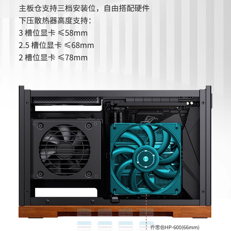 Jonsbo T9 hỗ trợ tản nhiệt CPU cao tối đa 78mm và có thể lắp thêm quạt 120mm ở phía trên (tùy chọn), giúp tối ưu luồng gió bên trong. Thiết kế nhiều khe thoát khí giúp giảm thiểu nhiệt độ hệ thống, đảm bảo máy hoạt động ổn định và êm ái ngay cả khi tải nặng.